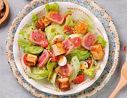 Тунец, салат айсберг, томаты черри, сухарики, яйцо перепелиное, чеснок, фирменная заправка, чеснок, кунжут.