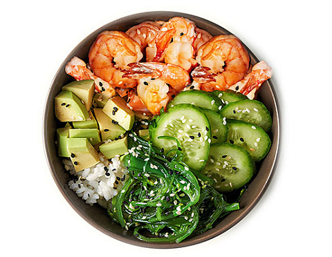 Тигровые креветки обжаренные в чесночном масле, авокадо, рис, свежий огурец, чука, ореховый соус, соус яки.