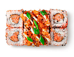 Тигровая креветка, спелый авокадо, нежный крем – краб, острый соус «Шрирачи», кляр , панировка.