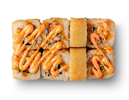 Лосось в кляре, творожный сыр, икра «Масаго», соус «Спайси», соус «Унаги», лук фри, зеленый лук, кунжут.