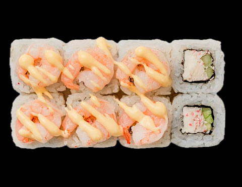 Тигровые креветки, крем-краб, творожный сыр, свежий огурчик, соус яки.
