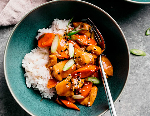 Филе куриное обжаренное в сладковато-остром соусе с морковью, болгарским перцем. Подается с рисом, зеленым луком и кунжутом.