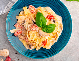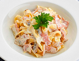 Паста фетучини, ветчина, шампиньоны, томат «Черри», грибной соус, сыр пармезан, сливки, сливочно-чесночное масло, специи, зелень.