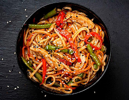 Лапша удон, филе куриное, грибы, болгарский перец, морковь, фасоль стручковая, соус WOK, кунжут, зеленый лук.