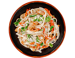 Лапша удон, тигровые креветки, болгарский перец, морковь, пекинская капуста, лук шалот, брокколи, стручковая фасоль, чеснок, соус WOK, кунжут.