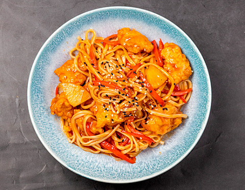 Лапша удон, филе куриное, ананас, морковь, болгарский перец, соус WOK, сливки, соус чили-манго, кунжут.