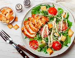 Обжаренное куриное филе, айсберг, романо, томат «Черри», сыр «Пармезан», гренки.