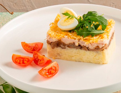 Копченая курочка, картофель, шампиньоны обжаренные с луком, тертый сыр, перепелиное яйцо, томат черри, зелень, майонез.