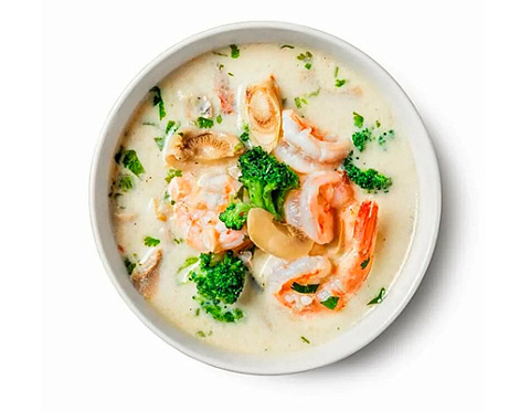 Кальмар, осьминог, креветки тигровые, морковь, лук шалот, томаты «Черри», брокколи, сливки, паста том – кха, шампиньоны, кинза, лайм, зеленый лук, рис.