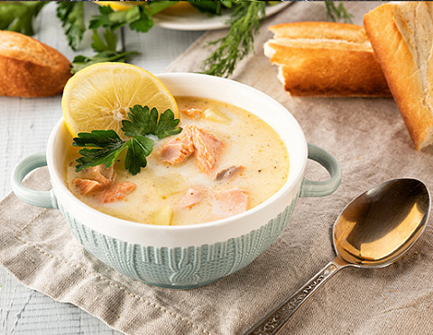 Лосось, картофель, жареный лук, морковь, сливочно- чесночное масло, рыбный бульон, лук шалот, сливки, сливочный сыр, специи, зелень, лимон.