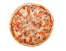 Бекон, ветчина, охотничьи колбаски, помидоры, сыр «моцарелла», фирменный томатный соус, зелень.