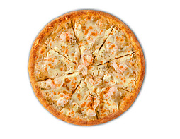 Ветчина, тигровые креветки , чесночное масло, сыр «моцарелла», фирменный томатный соус, зелень.