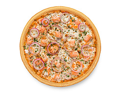 Семга, сыр «моцарелла», маринованный лук, фирменный томатный соус, специи, зелень.