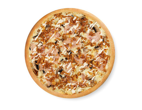 Курица, копченый бекон, шампиньоны, лук фри, чесночное масло, нежный соус «микс», сыр «моцарелла», соус чесночный ранч.