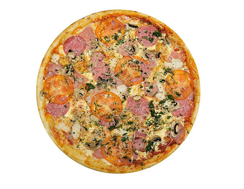 Ветчина, салями, шампиньоны, маринованный огурчик, помидоры, сыр «моцарелла», фирменный томатный соус, зелень.
