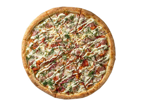 Бекон, маринованная свинина, копченая курица, охотничьи колбаски, опята, маринованный лук, сыр «моцарелла», фирменный томатный соус, пикантный соус «гриль», зелень.