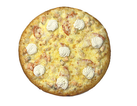 Семга, творожный сыр, помидоры, нежный сливочный соус, сыры «моцарелла» и «пармезан», специи.