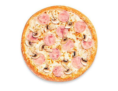 Ветчина, шампиньоны, томатный соус, сыр моцарелла, приправа для пиццы.