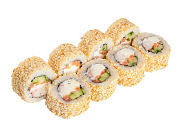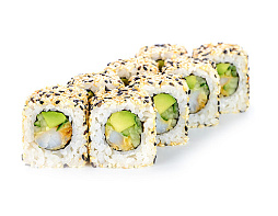 Креветка в кляре, авокадо, огурец, сливочный сыр, острый соус «Шрирачи», кунжут.