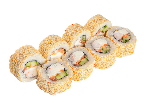 Тигровая креветка, лосось, свежий огурчик, творожный сыр, кунжут.