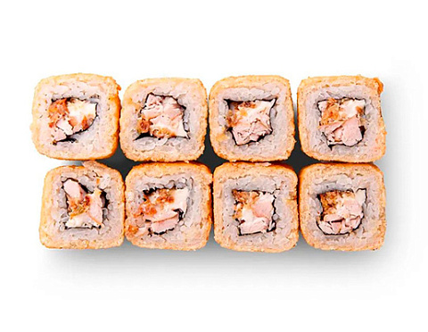 Копченая курочка, сливочный сыр, лук фри, кляр, панировка.