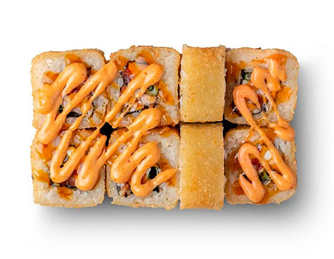 Курочка, творожный сыр, свежий томат, зеленый лук, острый соус «Шрирачи», пикантный соус «Спайси», кляр , панировка.