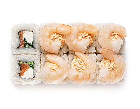 Лосось, салат «Айсберг», творожный сыр, нежный соус «Лава», тигровая креветка.
