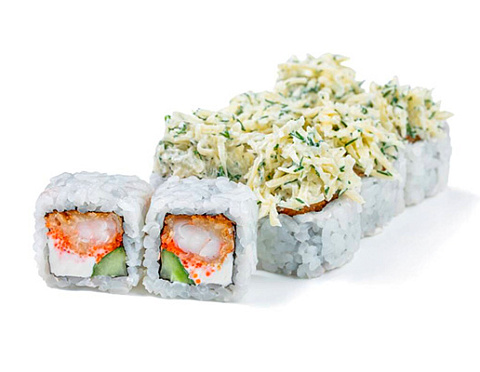 Креветка в кляре, икра «Масаго», творожный сыр, свежий огурчик, соус из сыра «Пармезан».