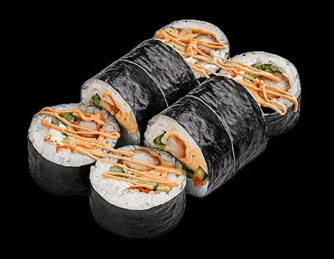 Креветка в кляре, томаго, сливочный сыр, свежий огурчик, соус яки.
