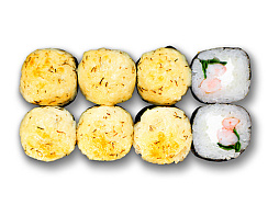 Творожный сыр, японский омлет «Томаго», сырная шапочка с мидиями.