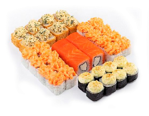 Филадельфия с луком, мацахиро, лава с жареным лососем, лава с креветкой, сырная курочка. (40 шт.)