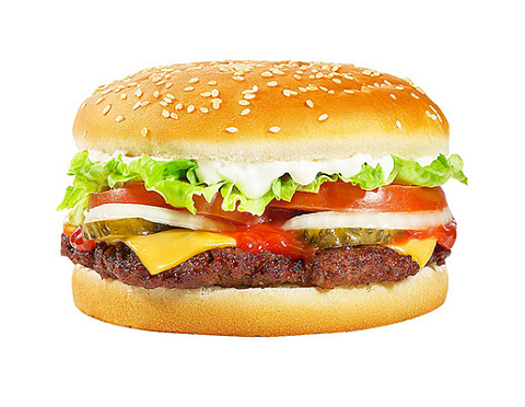 Булочка, котлета из 100% говядины, сыр «Чеддер», свежий томат, микс салата, рубленный лук, маринованный огурчик, классический соус.