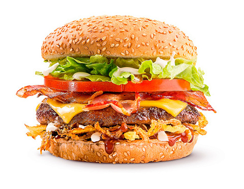 Булочка, котлета из 100% говядины, сыр «Чеддер», микс салата, свежий томат, лук фри, копченый бекон, соусы BBQ и чесночный.
