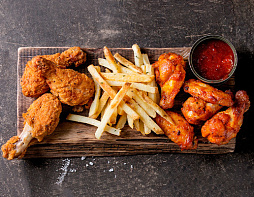 Острые куриные крылышки « Баффало» (130 гр.) куриные крылышки в панировке (130 гр.) картофель фри (100 гр.) томатный соус