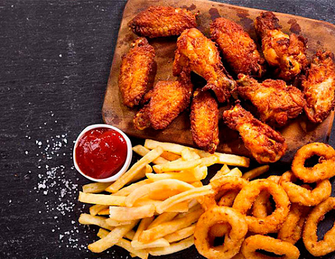 Большая порция острых крылышек «Баффало» (260 гр.) картофель фри (110 гр.) луковые кольца (100 гр.) томатный соус.